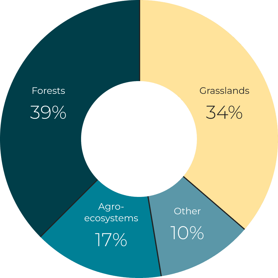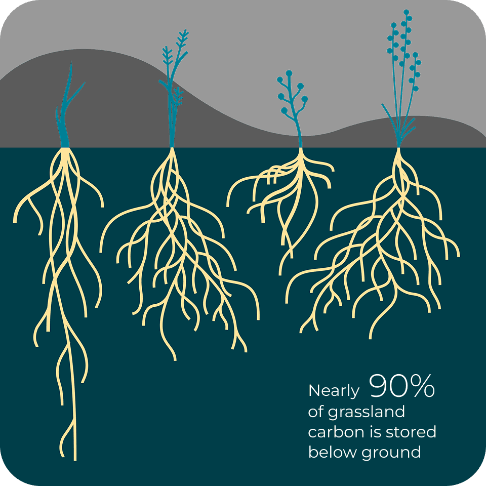 Learn moreGrasslands store up to 34% of the world's terrestrial carbon. Unlike trees, grasslands store 90% of its carbon below ground in deep roots and soil organic carbon (SOC), earning them the nickname “inverted forests.”